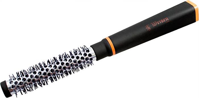 Расчёска термическая, круглая — Weisen. Предназначена для укладки волос и создания локонов с применением фена. Прорезиненную не скользящую ручку soft touch (нежное прикосновение) удобно держать в руках. Металлическая рабочая часть помогает держать нагрев от фена. Искусственная пластиковая щетина хорошо вытягивает и разглаживает волосы. Диаметр рабочей части 18 мм, длина всей расчески 240 мм. Цвет — черный с яркой цветной отделкой. Лёгкая, удобная в работе.