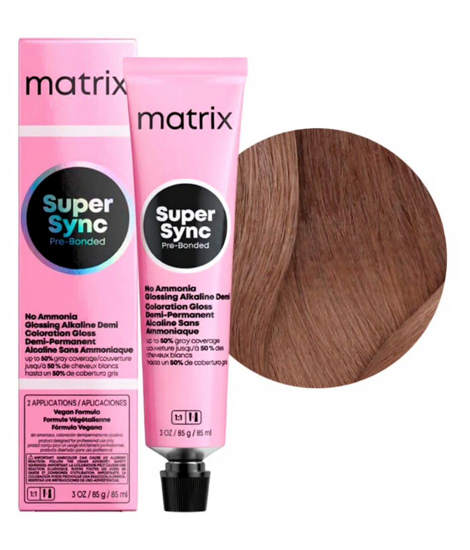 Только для профессионального использования. Смешайте краситель Super Sync Pre-Bonded с 3% крем-оксидантом Matrix в пропорции 1 к 1 и нанесите на волосы. Время выдержки – 20 мин.